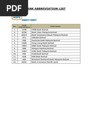 Bank Abbreviation Bank Name ID 1. Looking for the abbreviation of bank negara malaysia. BANK ABBREVIATION LIST No.